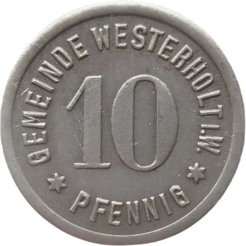 | 表面の銘文 | GEMEINDE WESTERHOLT i.W. 10 ✶ PFENNIG ✶ |