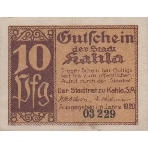 10 pfg. Kahla S.A. 10 pfg. (Translation: 10 pfg. (10 Pfennig) Kahla S.A. (Saxe-Altenburg) 10 pfg.) |