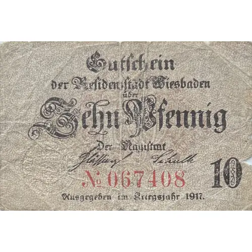Gutschein der Residenzstadt Wiesbaden über Zehn Pfennig Der Magistmt Kusgegeden im Kriegsjahr 1917 (Translation: Voucher from the Residence City of Wiesbaden for Ten Pfennigs The Magistrate Commemoration of the War Year 1917) |