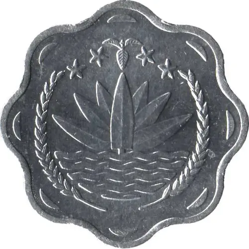 | توضیحات روی سکه | The National Emblem of Bangladesh: a water lily bordered on two sides by rice sheaves. Above are a three-leaf clover of tea leaves and four stars representing the four principles of the first constitution of Bangladesh in 1972: nationalism, secularism, socialism, and democracy. |