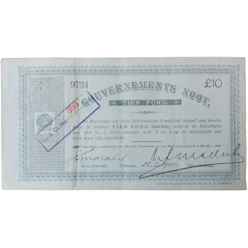 9734 £10 GOUVERNMENTS NOOT. TIEN POND. De Regeering der Zuid-Afrikaansche Republiek belooft aan houder dezes te betalen TIEN POND Sterling, volgens de bepalingen van Wet 1, 1900, waarin artt. 2 en 3 op de achterzijde van deze noot zijn afgedrukt. Deze Noot is gewaarborgd door alle Vaste Eigendommen van den Staat, zooals bepaald in Wet 1, 1900. Audt.-Generaal. Pretoria, 28.05.1900. Thes.-Generaal Gedrukt ter Staatsdrukkerij van de Z.A Republiek |