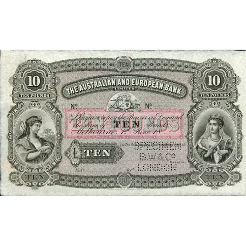 | Obverse lettering | TEN POUNDS The Australian and European Bank Limited TEN POUNDS Promise to pay the Bearer on Demand the Sum of TEN Pounds Melbourne 1st June 18__ For the Australian and European Bank Limited TEN Manager________ Ent:_______Acct_________ |