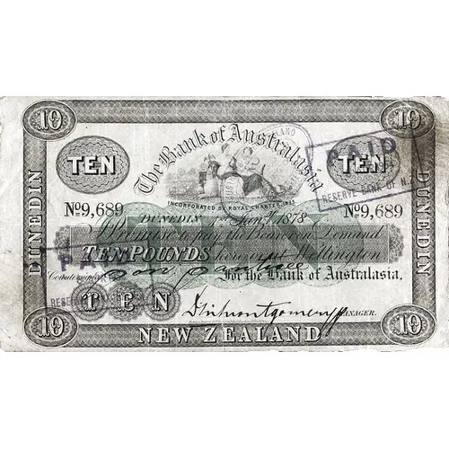 TEN TEN BANK OF AUSTRALASIA INCORPORATED BY ROYAL CHARTER 1835 PROMISE TO PAY THE BEARER ON DEMAND TEN POUNDS HERE OR AT WELLINGTON FOR THE BANK OF AUSTRALASIA TEN NEW ZEALAND DUNEDIN DUNEDIN |