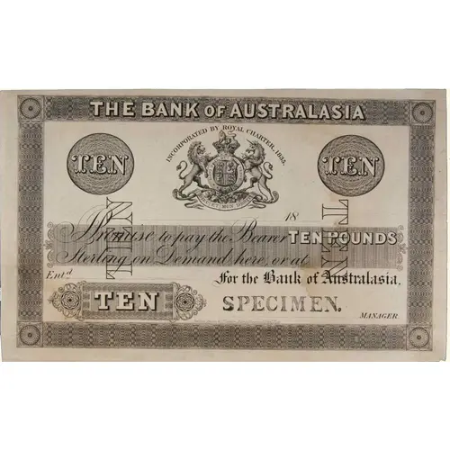 | Obverse lettering | THE BANK OF AUSTRALASIA INCORPORATED BY ROYAL CHARTER, 1835. TEN TEN PROMISE TO PAY THE BEARER TEN POUNDS STERLING ON DEMAND HERE OR AT FOR THE BANK OF AUSTRLASIA TEN NEW ZEALAND |