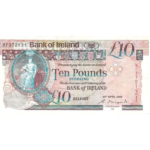 | Obverse lettering | Bank of Ireland I Promise to pay the bearer on demand Ten Pounds Sterling For the Governor and Company of the BANK of IRELAND BELFAST |