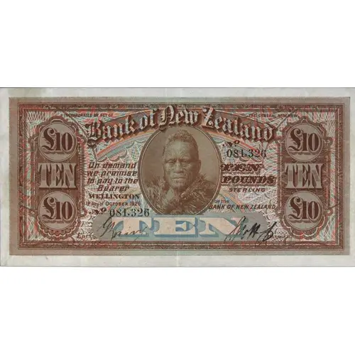 BANK OF NEW ZEALAND INCORPORATED BY ACT OF THE GENERAL ASSEMBLY ON DEMAND WE PROMISE TO PAY THE BEARER TEN POUNDS STERLING WELLINGTON FOR THE BANK OF NEW ZEALAND |