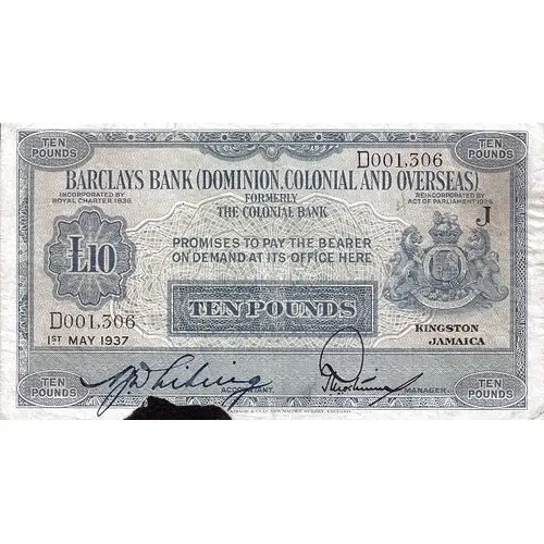 BARCLAYS BANK (DOMINION COLONIAL AND OVERSEAS) FORMERLY THE COLONIAL BANK PROMISES TO PAY THE BEARER ON DEMAND AT ITS OFFICE HERE INCORPORATED BY ROYAL CHARTER 1836 REINCORPORATED BY ACT OF PARLIAMENT 1925 TEN POUNDS KINGSTON JAMAICA ACCOUNTANT MANAGER |