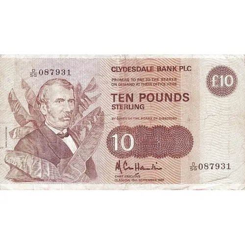 Clydesdale Bank PLC Promise to pay the bearer on demand at their office here Ten Pounds Sterling by order of the Board of Directors |
