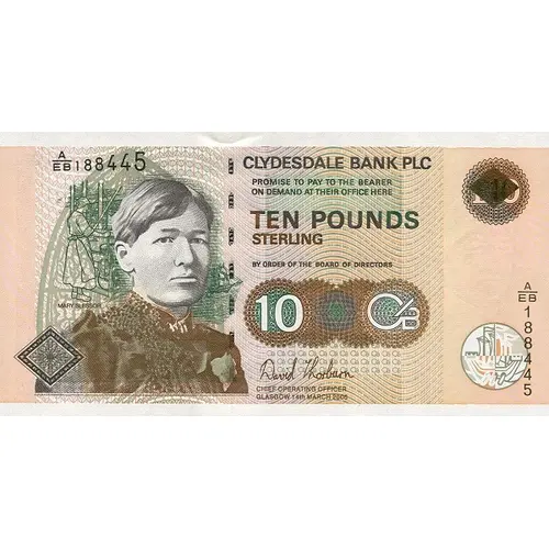 CLYDESDALE BANK PLC PROMISE TO PAY TO THE BEARER ON DEMAND AT THEIR OFFICE HERE TEN POUNDS STERLING BY ORDER OF THE BOARDS OF DIRECTORS 10 CHIEF EXECUTIVE GLASGOW 5th NOVEMBER 1998 MARY SLESSOR £10 |