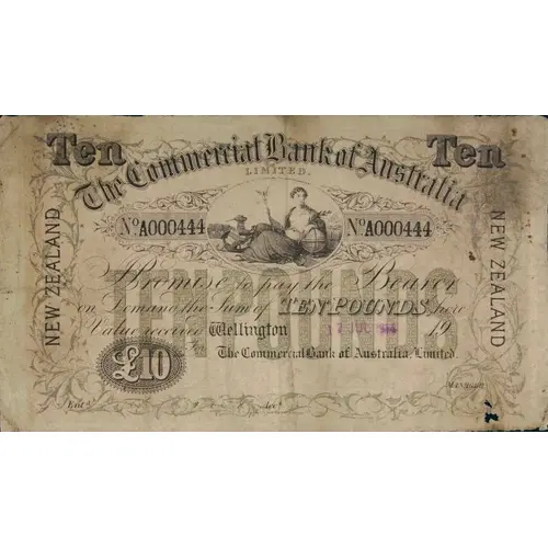 | Obverse lettering | TEN TEN THE COMMERCIAL BANK OF AUSTRALIA LIMITED PROMISE TO PAY THE BEARER ON DEMAND THE SUM OF TEN POUNDS HERE VALUE RECEIVED WELLINGTON NEW ZEALAND NEW ZEALAND THE COMMERCIAL BANK OF AUSTRALIA LIMITED |