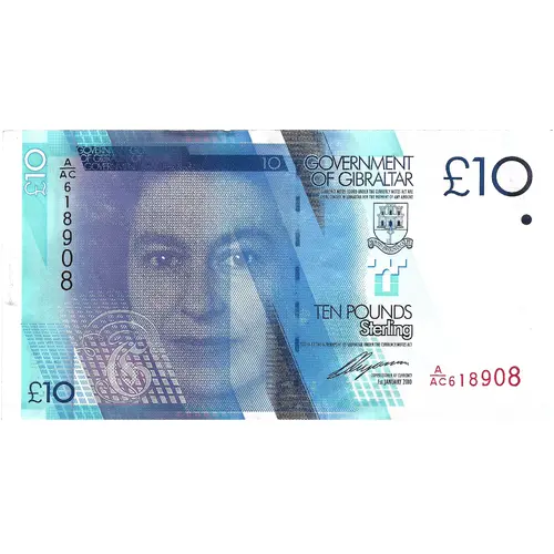 GOVERNMENT OF GIBRALTAR CURRENCY NOTES ISSUED UNDER THE CURRENCY NOTES ACT ARE LEGAL TENDER IN GIBRALTAR FOR THE PAYMENT OF ANY AMOUNT TEN POUNDS STERLING ISSUED BY THE GOVERNMENT OF GIBRALTAR UNDER THE CURRENCY NOTES ACT COMMISSIONER OF CURRENCY 1ST JANUARY 2010 |