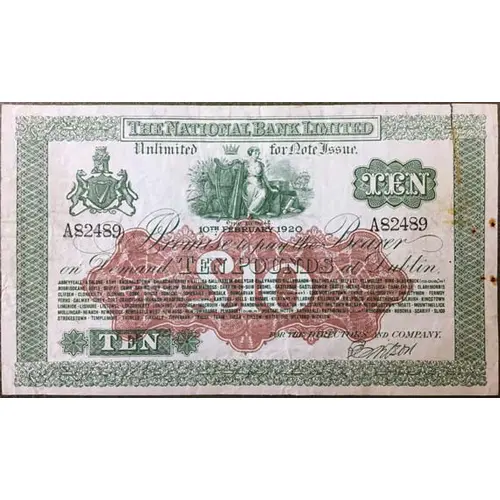 | Obverse lettering | The National Bank Limited Unlimited for Note Issue I Promise to pay the Bearer on Demand Ten Pounds at Dublin For the Directors and Company |