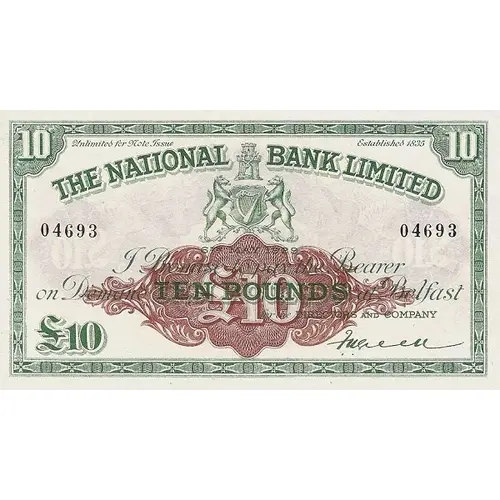 | Obverse lettering | Unlimited for Note Issue - Established 1835 The National Bank Limited I Promise to pay the Bearer on Demand Ten Pounds at Belfast For the Directors and Company |