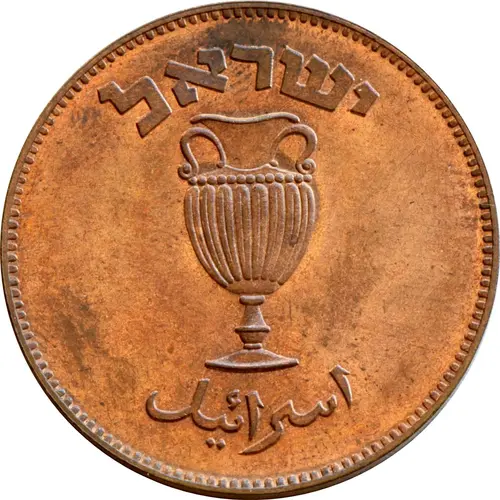 | Mintage | 5709 (1949) - תש׳ט (Proof; Struck at Imperial Chemical Industries (Great Britain)) - 20 000 5709 (1949) - תש׳ט (Without pearl; Struck at Heaton (Birmingham)) - 7 500 000 5709 (1949) • - תש׳ט (With pearl; Struck at Imperial Chemical Industries (Great Britain)) - 7 428 000 |
