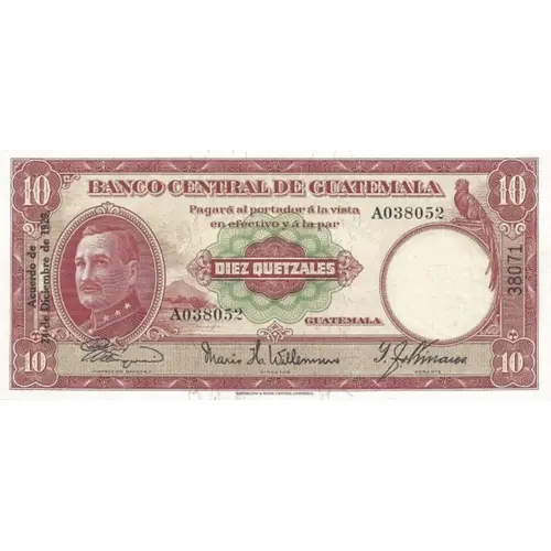 | Obverse lettering | BANCO CENTRAL DE GUATEMALA Pagará al portador á la vista en efectivo y á la par DIEZ QUETZALES GUATEMALA Acuerdo de 24 de Diciembre de 1929. (Translation: Central Bank of Guatemala Pay to Bearer at sight in cash Ten Quetzals According December 24th., 1929.) |
