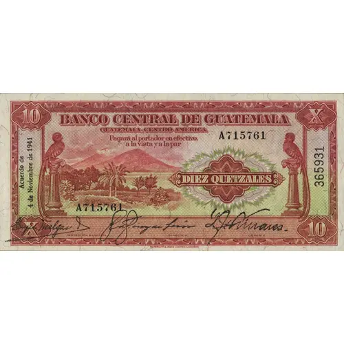 | Obverse lettering | BANCO CENTRAL DE GUATEMALA GUATEMALA, CENTRO AMÉRICA Pagará al portador en efectivo, á la vista y á la par DIEZ QUETZALES Acuerdo de 4 de Noviembre de 1941. (Translation: Central Bank of Guatemala Guatemala, Central America Pay to Bearer at sight in cash Ten Quetzals According November 4th., 1941.) |