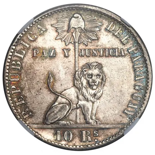 REPUBLICA DEL PARAGUAY PAZ Y JUSTICIA 10 Rs. (Translation: Republic of Paraguay Peace and Justice (National motto of Paraguay) 10 Reales) |