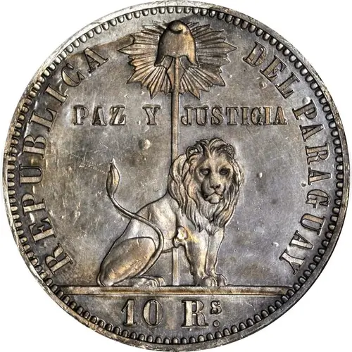 REPUBLICA DEL PARAGUAY PAZ Y JUSTICIA 10 Rs (Translation: Republic of Paraguay Peace and Justice (National motto of Paraguay) 10 Reales) |