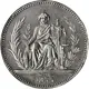 Seated woman (Liberty) with symbols of peace (olive branch) and justice (sword and scales) with year of issue below |