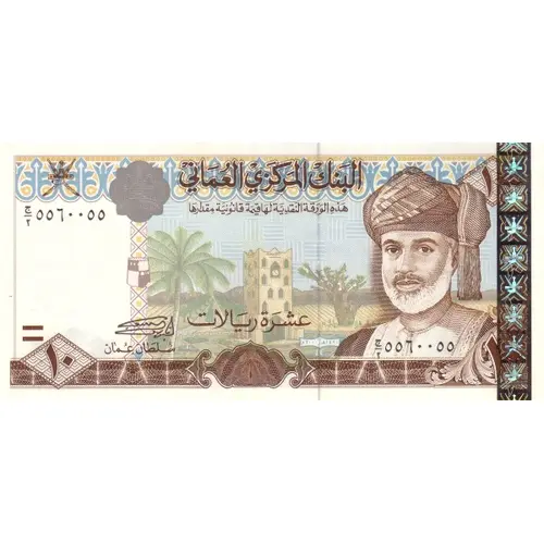 Reverse description Mutrah fort and Corniche at left center. Number 10 at both corners to the left , and lower right corner.