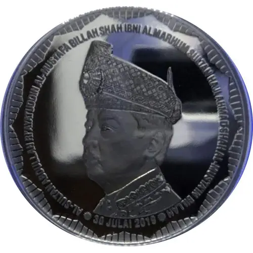 The portrait of Seri Paduka Baginda Yang di-Pertuan Agong XVI, His Majesty Al-Sultan Abdullah Ri’ayatuddin Al-Mustafa Billah Shah Ibni Almarhum Sultan Haji Ahmad Shah Al-Musta’in Billah, is featured at the centre of the coin. The words `AL-SULTAN ABDULLAH RI’AYATUDDIN AL-MUSTAFA BILLAH SHAH IBNI ALMARHUM SULTAN HAJI AHMAD SHAH AL-MUSTA’IN BILLAH` are inscribed along the circumference of the coin with the date of the installation depicted at the bottom of the portrait of His Majesty Seri Paduka Baginda Yang di-Pertuan Agong XVI. The decorative element of the 14-cornered umbrella pattern symbolises His Majesty as offering an `umbrella of protection` to 14 states in Malaysia and this is shown around the portrait of Seri Paduka Baginda Yang di-Pertuan Agong. |