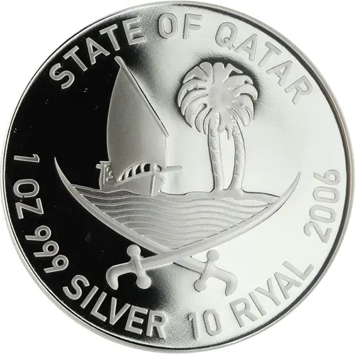 | Obverse lettering | STATE OF QATAR 1 OZ 999 SILVER 10 RIYAL 2006 |