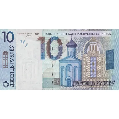 | Chữ khắc mặt trước | ДЗЕСЯЦЬ РУБЛЁЎ 10 2009 НАЦЫЯНАЛЬНЫ БАНК РЭСПУБЛІКІ БЕЛАРУСЬ ДЗЕСЯЦЬ РУБЛЁЎ (Translation: Ten Rubles, National Bank of the Republic of Belarus) |