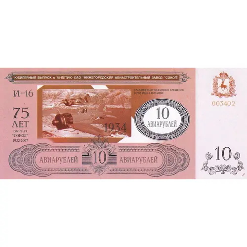 | Obverse lettering | ЮБИЛЕЙНЫЙ ВЫПУСК К 75-ЛЕТИЮ OAO `НИЖЕГОРОДСКИЙ АВИАСТРОИТЕЛЬНЬІЙ ЗАВОД `СОКОЛ` САМОЛЕТ ПОЛУЧИЛ БОЕВОЕ КРЕЩЕНИЕ В 1936 ГОДУ В ИСПАНИИ И-16 75 ДЕТ ОАО `НАЗ `CОKOЛ` 1932-2007 АВИАРУБЕЙ 10 АВИАРУБЕЙ (Translation: ANNIVERSARY ISSUE FOR THE 75TH ANNIVERSARY OF THE NIZHNY NOVGOROD AIRCRAFT PLANT `SOKOL` THE AIRCRAFT RECEIVED ITS BAPTISM OF FIRE IN 1936 IN SPAIN I-16 75 `FALCON` 1932-2007 AVIATION ROUBLES 10 AVIATION ROUBLES) |