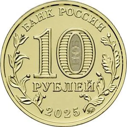 | Popis líce | The obverse of the coin features the inscriptions around the circumference: ‘БАНК РОССИИ’ (BANK OF RUSSIA) at the top and ‘2025’ at the bottom. There are images of laurel and oak twigs on the left and right, respectively. The figure ‘10’ and the inscription ‘РУБЛЕЙ’ (ROUBLES) below denoting the face value of the coin are in the centre. The figure ‘0’ features a security element inside in the form of the figure ‘10’ and the inscription ‘РУБ’ (RUB) visible at various viewing angles to the coin surface. The Moscow Mint trademark is at the bottom. |