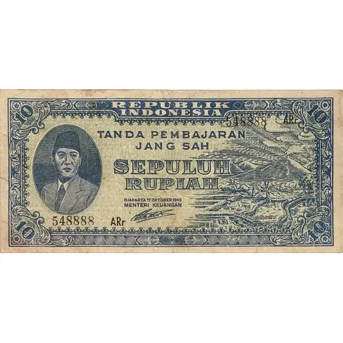 REPUBLIK INDONESIA TANDA PEMBAJARAN JANG SAH SEPULUH RUPIAH DJAKARTA 17 OKTOBER 1945 MENTERI KEUANGAN |