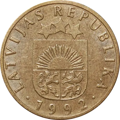 Artistry: The design of the 10 Santimu reflects a conscious return to national symbols, embodying a classical, nationalistic stylistic school. The obverse prominently features the Greater Coat of Arms of Latvia, depicting a rising sun, three stars, a lion, and a griffin, all emblematic of Latvian history and regions. The reverse displays the denomination "10 SANTIMU" encircled by stylized oak leaves and acorns, a traditional symbol of strength and resilience in Latvian folklore. The aesthetic aimed to reassert a distinct Latvian cultural heritage.