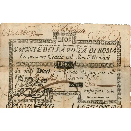 | Descrição do anverso | PONTIFICAL STATE VATICAN First Roman Republic Sacro Monte della Pietà in Rome Coupon for ten Roman shields |