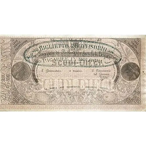 | نوشتههای روی اسکناس | LA LEGGR PUNISCE IL FALSIFICATORE LA LEGGE PUNISCE IL FALSIFICATORE BIGLIETTO PROVVISORIO della Banco di Bologna perle 4. Legacioni PAGABILE IN BOLOGNA BANCA DELLO STATO PONTIFICIO Scudi Dieci. il Governatore. il Cassiere. il Cassiere. il Commissario del Governo. LA BANCA NON RIGONOSCE I BIGLIETTI VIZIATI. |