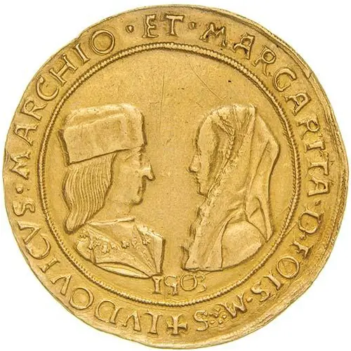| Obverse description | Confronting busts of Ludovico, wearing a hat and the collar of the Order of St. Michael, and Margarita wearing a veil. |
