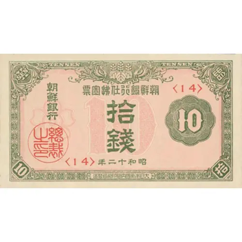 | 正面铭文 | 朝鮮銀行 10 錢 (大日本帝國印刷局) (Translation: Bank of Chōsen 10 (Jeon / Sen) Japanese Government Printing Bureau) |