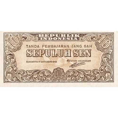 REPUBLIK INDONESIA TANDA PEMBAJARAN JANG SAH SEPULUH SEN DJAKARTA 17 OKTOBER 1945 MENTERI KEUANGAN |
