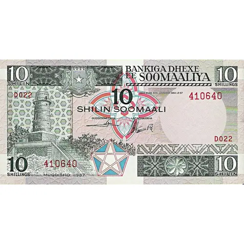 | Reverse lettering | البنك المركزي في الصومال CENTRAL BANK OF SOMALIA ١٠ شلن صومالي (Translation: Central Bank of Somalia, 10 Somali Shillings) |