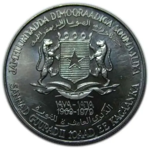 | Obverse lettering | JAMHUURIYADDA DIMOQRAADIGA SOOMAALIYA الجمورية الصومال الديمقراطية ١٩٦٩-١٩٧٩ 1969-1979 الذكرى العاشرة الثورة SANNAD GUURADII 10AAD EE KAGAANKA (Translation: Democratic Republic of Somalia 1969-1979 Tenth Anniversary of the Revolution) |