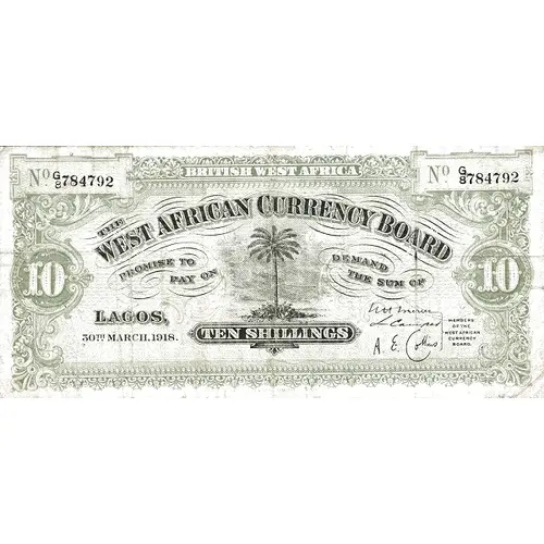 | Obverse lettering | BRITISH WEST AFRICA THE WEST AFRICAN CURRENCY BOARD PROMISE TO PAY ON DEMAND THE SUM OF TEN SHILLINGS |