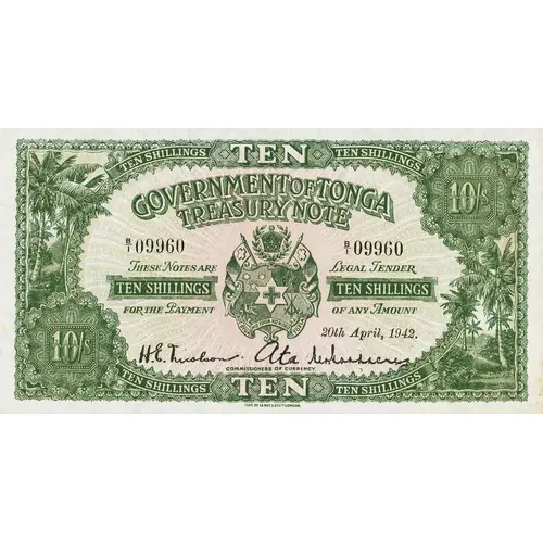 | Obverse lettering | TEN SHILLINGS GOVERNMENT OF TONGA TREASURY NOTE THESE NOTES ARE LEGAL TENDER TEN SHILLINGS FOR THE PAYMENT OF ANY AMOUNT 20th April, 1942 COMMISSIONERS OF AMOUNT TEN |