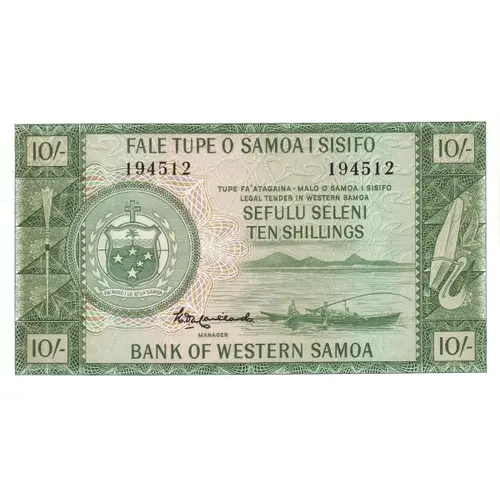 | Reverse lettering | FALE TUPE O SAMOA I SISIFO TEN SHILLINGS SEFULU SELENI BANK OF WESTERN SAMOA (Translation: Western Samoa Bank, Ten Shillings) |