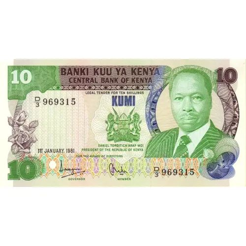 10 BANKI KUU YA KENYA CENTRAL BANK OF KENYA LEGAL TENDER FOR TEN SHILLINGS KUMI HARAMBE DANIEL TOTOITCH ARAP MOI PRESIDENT OF THE REPUBLIC OF KENYA FOR THE BOARD OF DIRECTORS (Translation: Central Bank of Kenya Ten All pull together) |