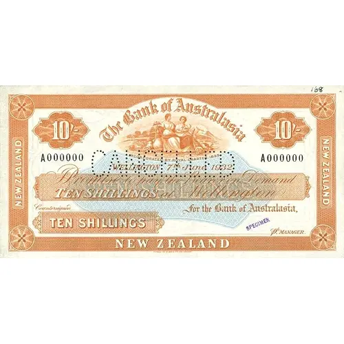 | Obverse lettering | THE BANK OF AUSTRALASIA INCORPORATED BY ROYAL CHARTER 1835 PROMISE TO PAY THE BEARER ON DEMAND 10 SHILLINGS AT WELLINGTON TEN SHILLINGS NEW ZEALAND |
