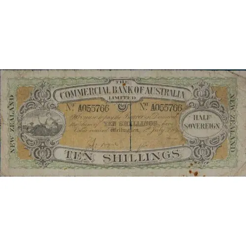| Obverse lettering | THE COMMERCIAL BANK OF AUSTALIA LIMITED PROMISE TO PAY THE BEARER IN DEMAND THE SUM OF TEN SHILLINGS HERE VALUE RECEIVED WELLINGTON HALF SOVEREIGN NEW ZEALAND NEW ZEALAND TEN SHILLINGS |