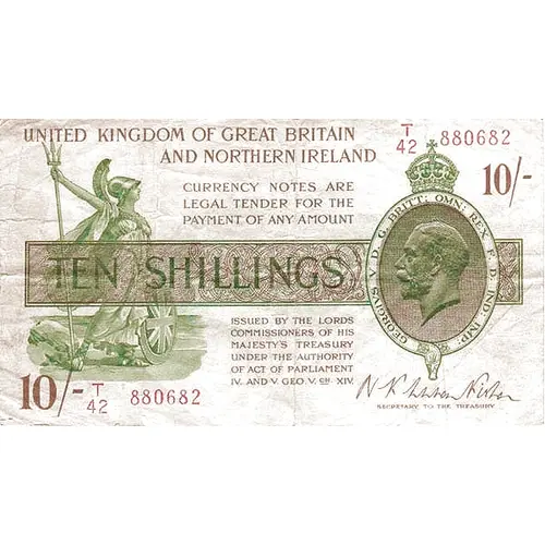 United Kingdom of Great Britain and Northern Ireland Currency Notes are Legal Tender for the payment of any amount Ten Shillings Issued by the Lords Commissioners of His Majesty`s Treasury under the Authority of Act of Parliament IV & V Geo.V.ch XIV 10/- |