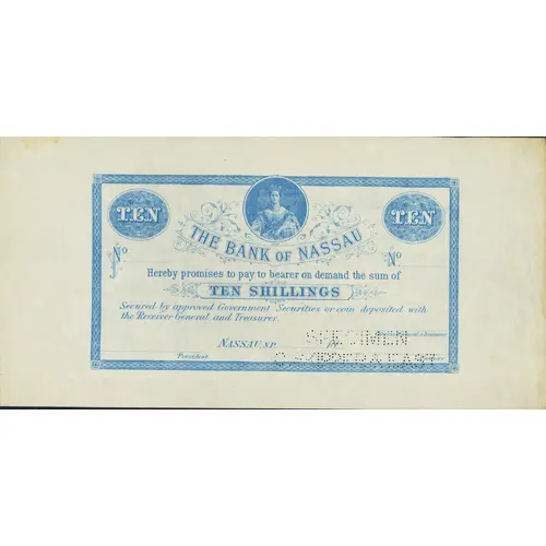 | Obverse lettering | TEN THE BANK OF NASSAU Hereby promises to pay the bearer in demand the sum of TEN SHILLINGS Secured by approved Government Securities or coin deposited with the Receiver General and Treasurer Receiver General and Treasurer NASSAU, N.P. 18_ President Cashier |