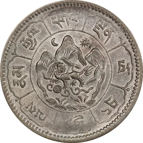 | Obverse description | Snow lion facing left in front of Mount Kailash with a sun and a moon in the background, all surrounded by Tibetan characters within the petals of an eight-petalled lotus. |