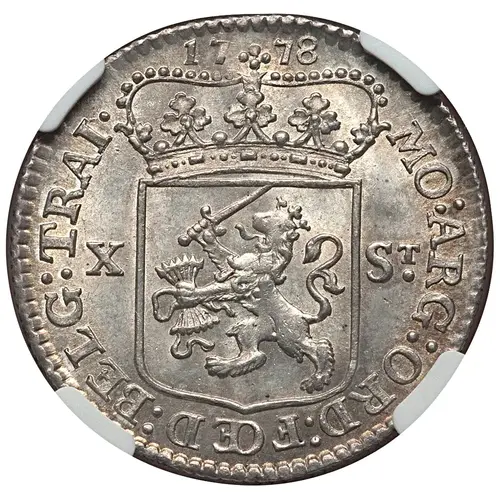 MO : ARG : ORD : FOED : BELG : TRAI X St (Translation: Silver coin from the United Provinces of the Netherlands, Utrecht Ten stuivers) |