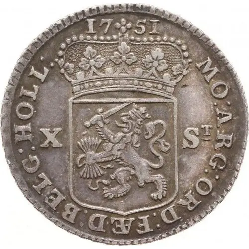 MO : ARG : ORD : FÆD : BELG : HOLL : 1748 X ST (Translation: Silver coin of Holland of the United provinces of the Netherlands, Holland) |