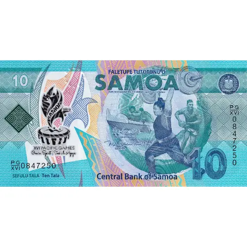 | Opis líce | FALETUPE TUTOTONU O SAMOA TUPE FA`ATAGAINA-MALO O SAMOA Legal Tender In Samoa SEFULU TALA Ten Tala Central Bank of Samoa |